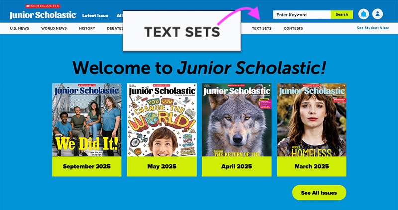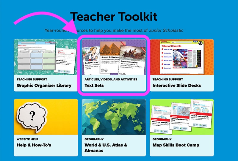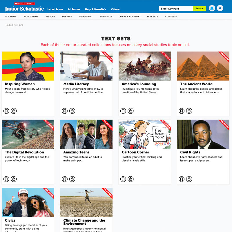 Text sets are collections of articles and videos curated by the editors of Junior Scholastic—plus graphic organizers, close-reading questions, and other teaching resources to help students compare texts and integrate information.