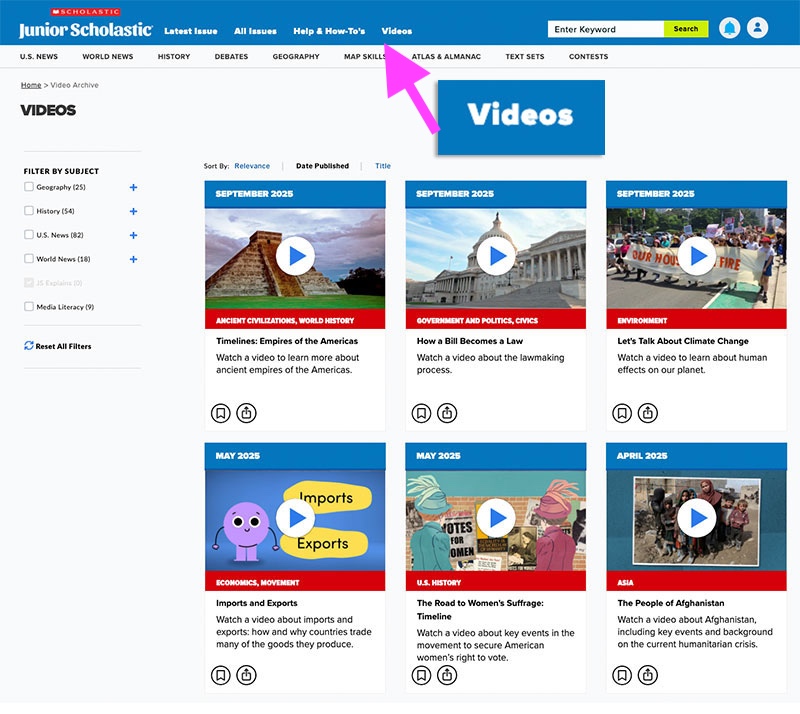 Looking for something specific? Use the search bar at the top right of any Junior Scholastic page. Then, use the left-hand menu to filter results by type (article, video, etc.) or by subject. You can also sort by relevance, date published, or title.